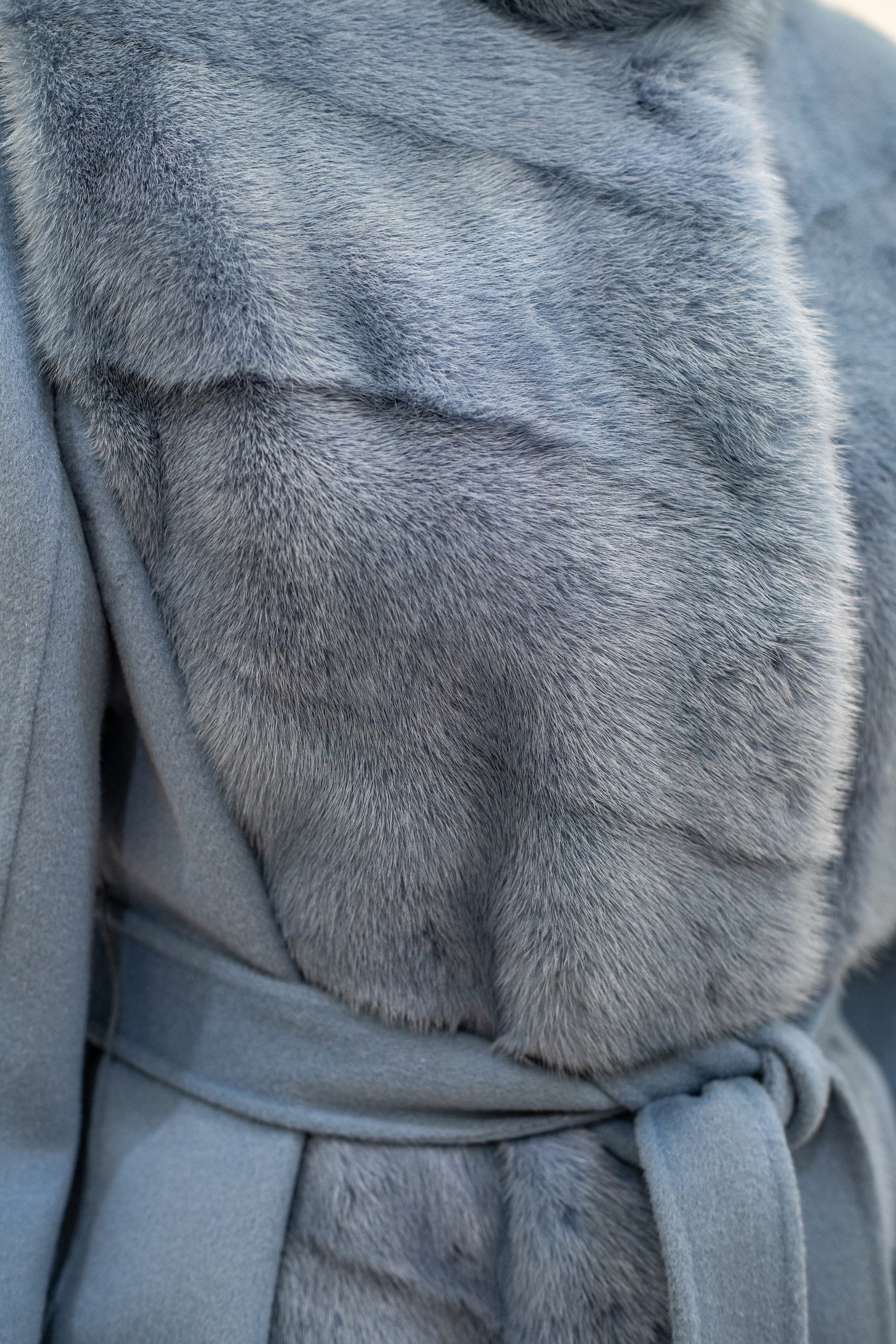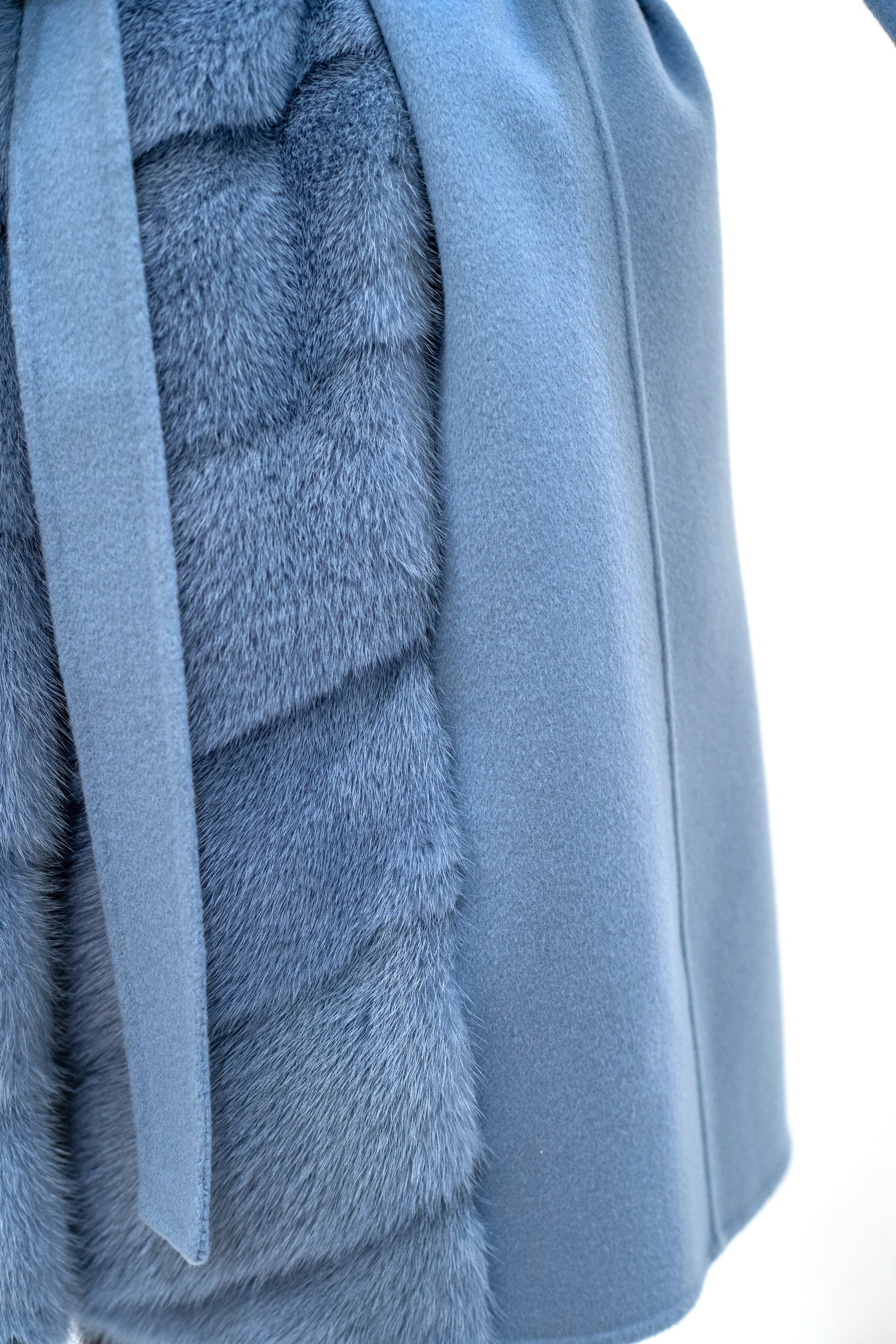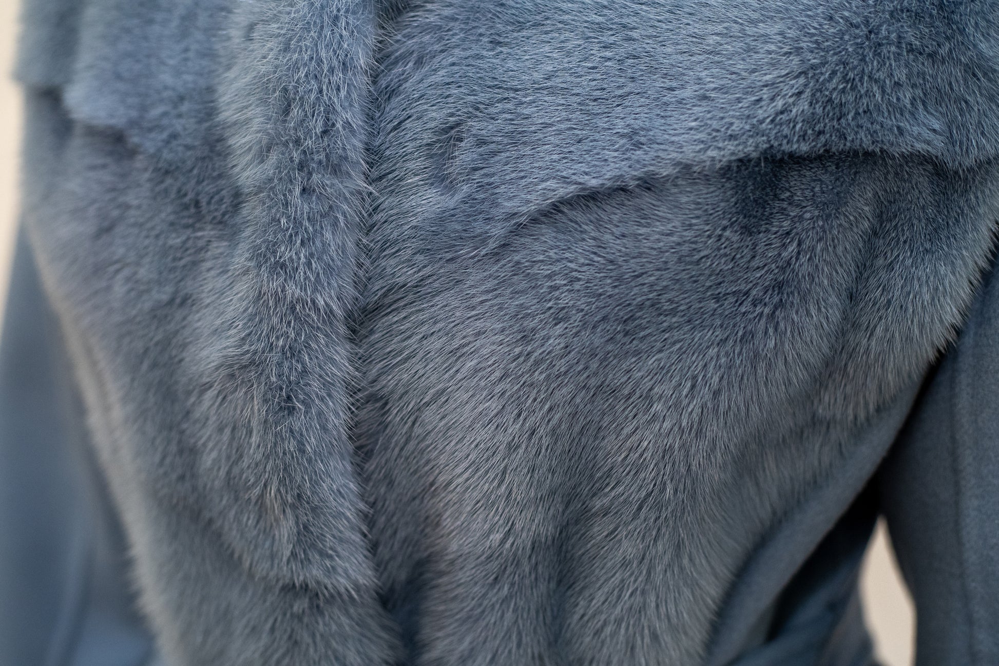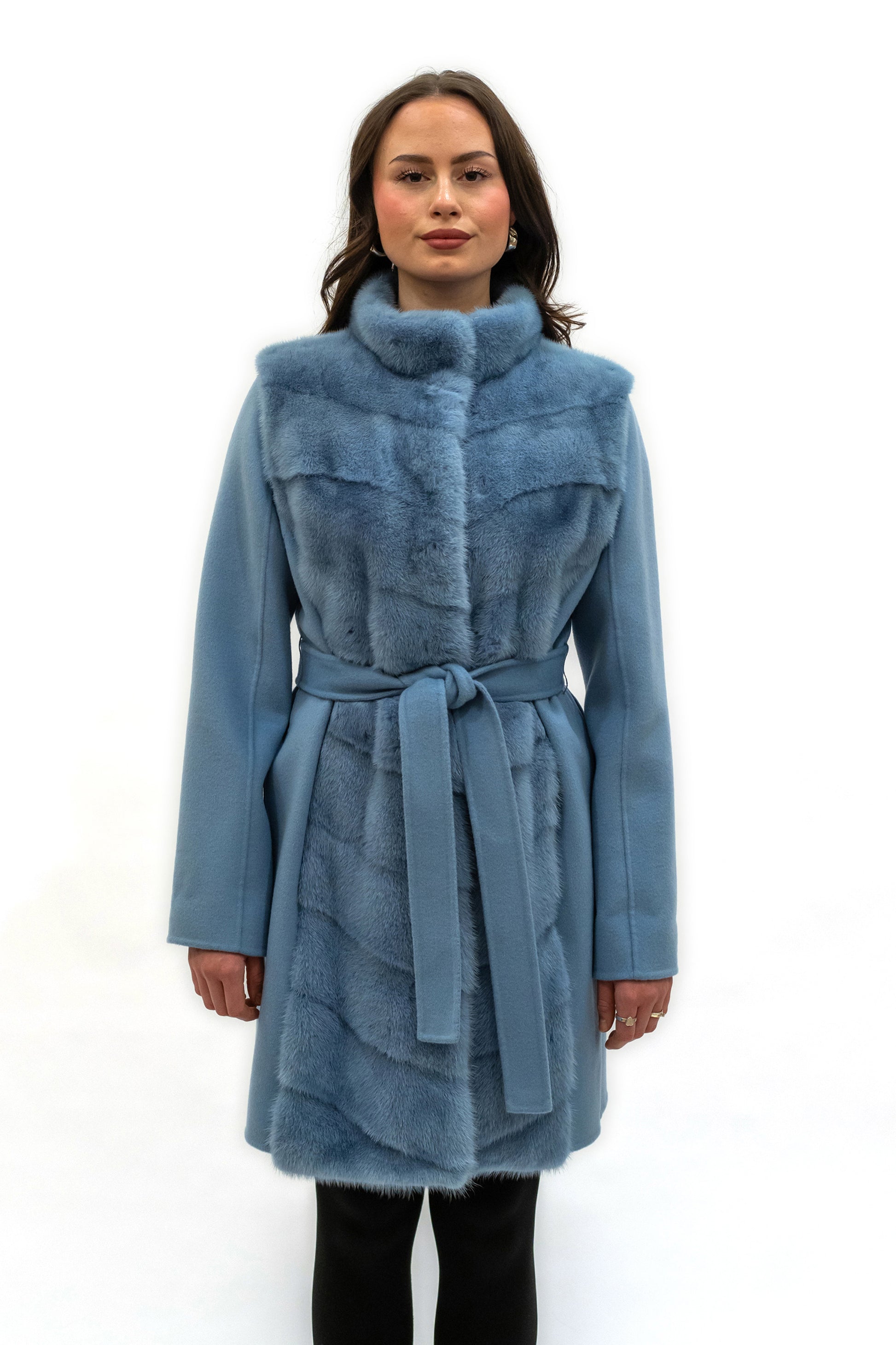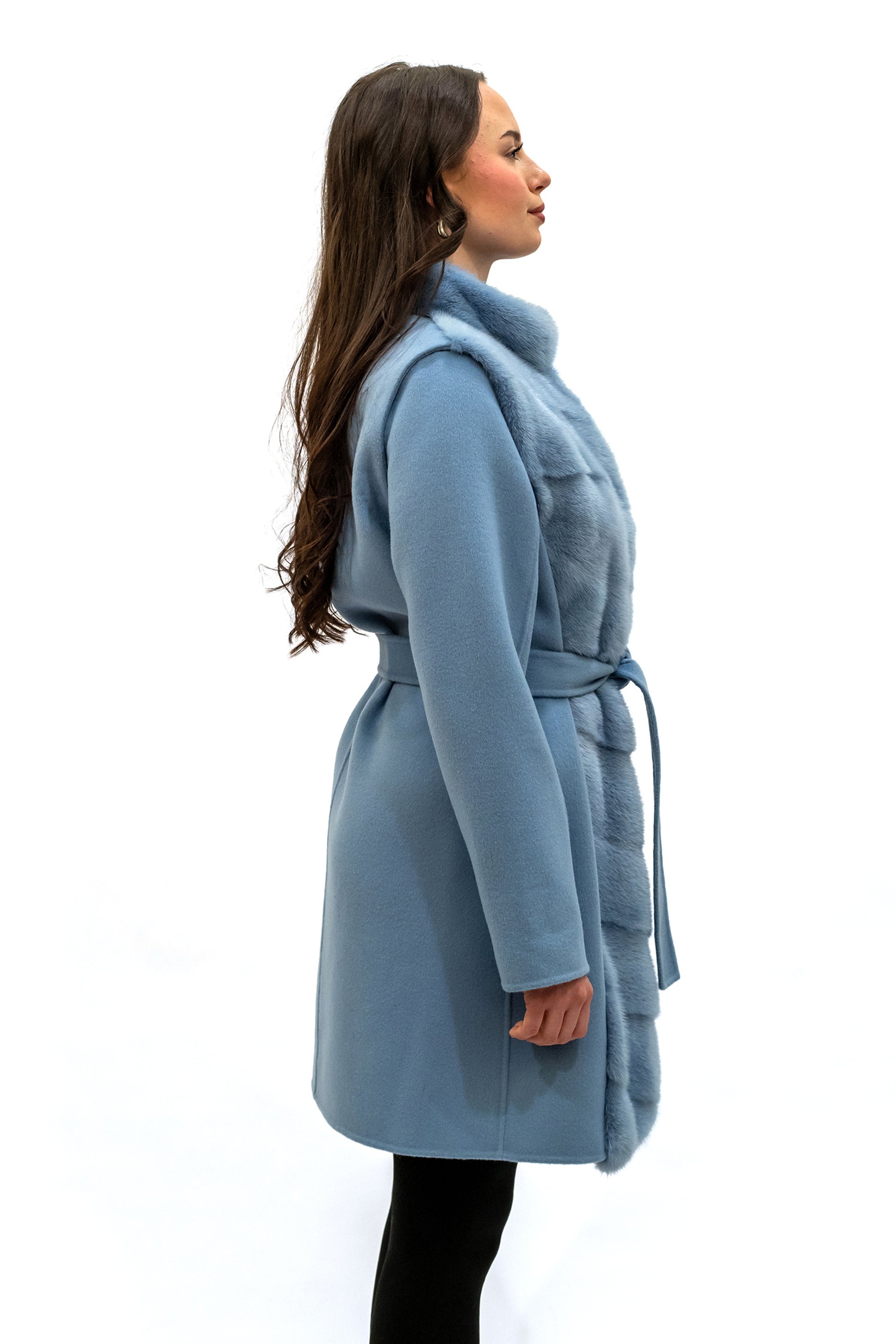 Femininer Wollmantel mit Gürtel und quer angeordneten Nerzstreifen auf der Vorderseite. Die Ärmel lassen sich sehr einfach mittels Reißverschluss abnehmen und so wird aus Ihrem Mantel eine wunderschöne lange Weste.