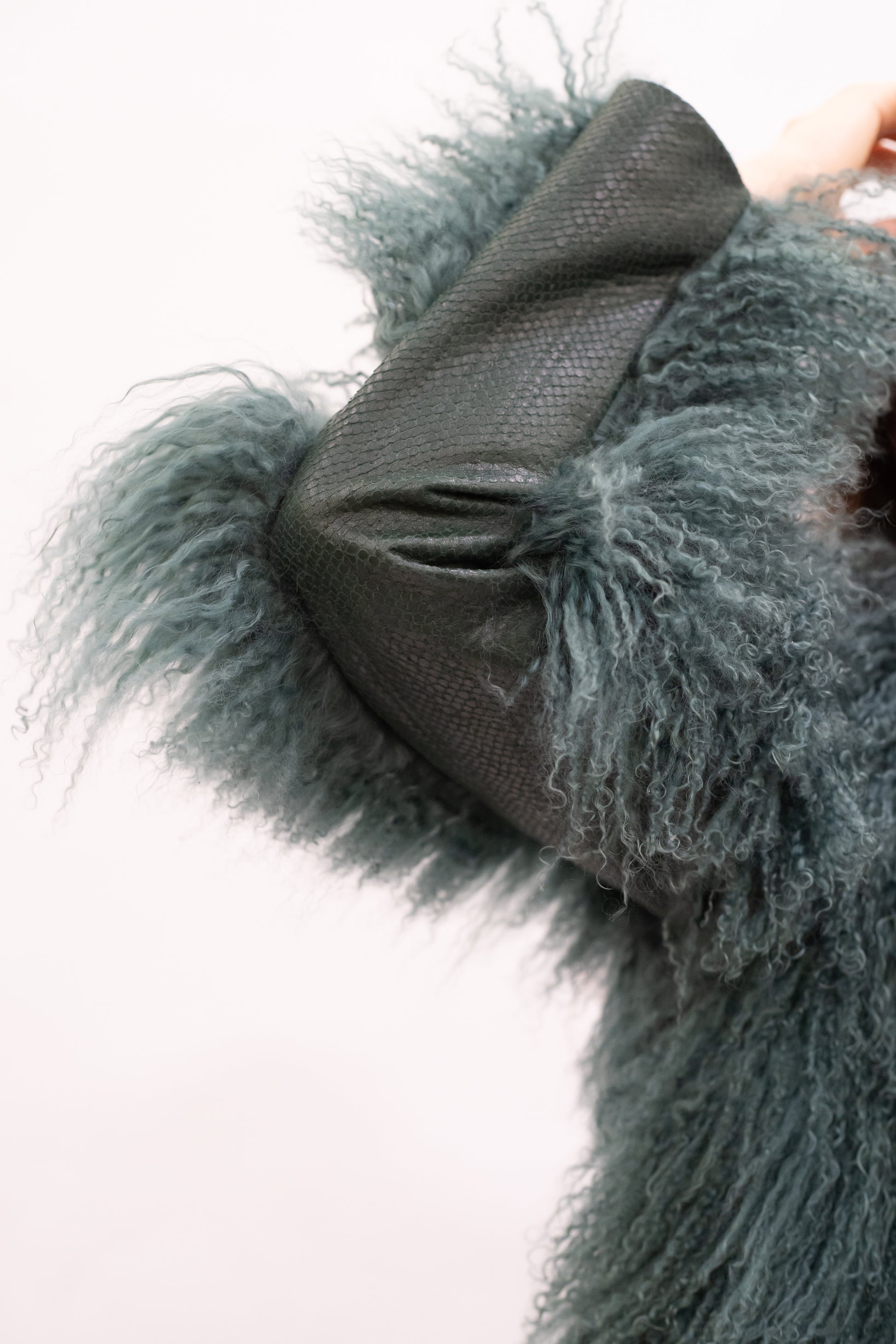 Außergewöhnliche Zottel-Jacke aus Tibetlammfell.  Aufwendig verarbeitet mit farblich abgestimmten Krokoleder im unteren Armbereich und an beiden Seiten der Jacke.