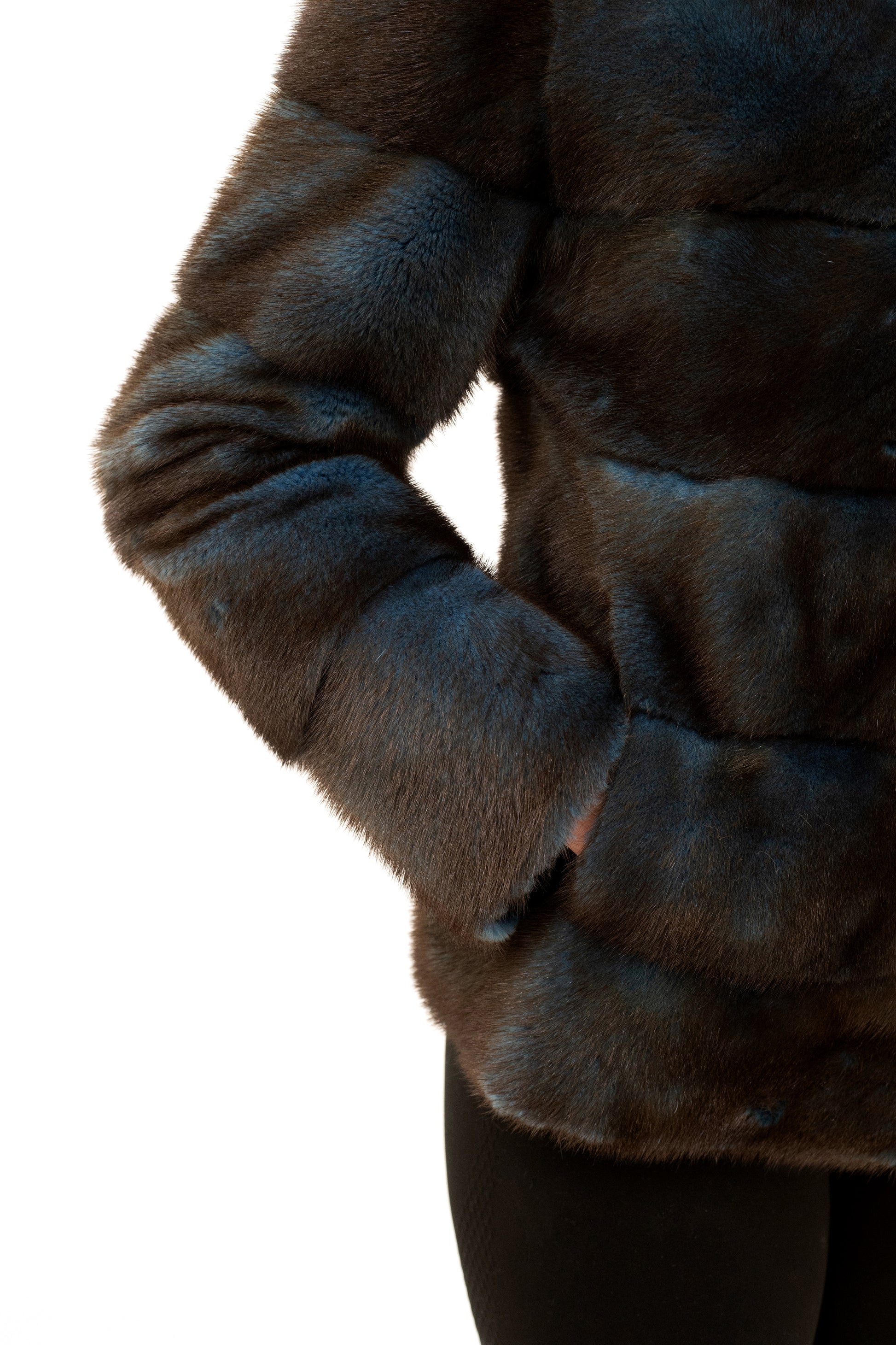 Besondere Kurzjacke mit quer verarbeiteten Nerzen. Das Innenfutter ist aus braunem Seidenmix und die Vorderkanten sind mit dunkelblauem Nappaleder abgesetzt.