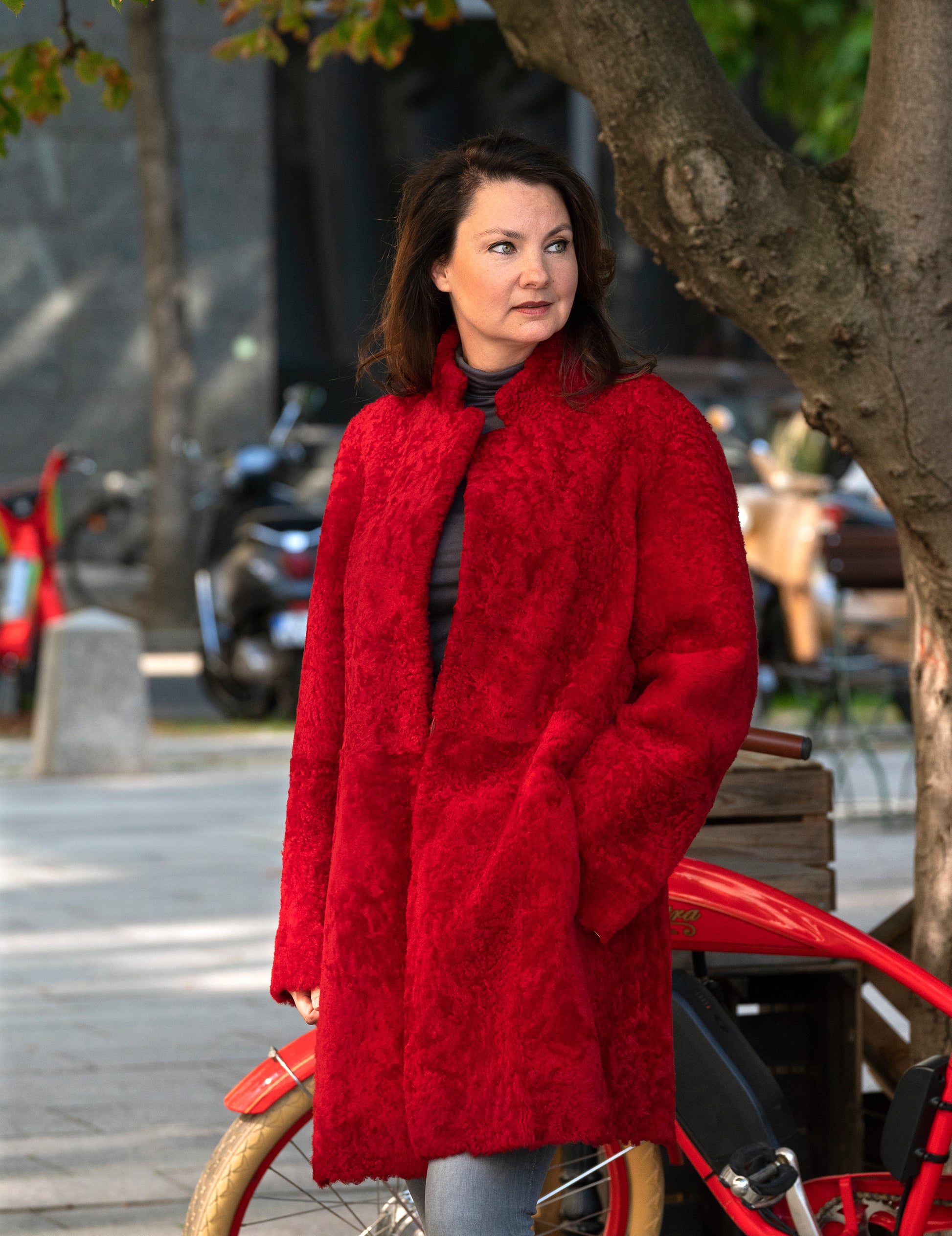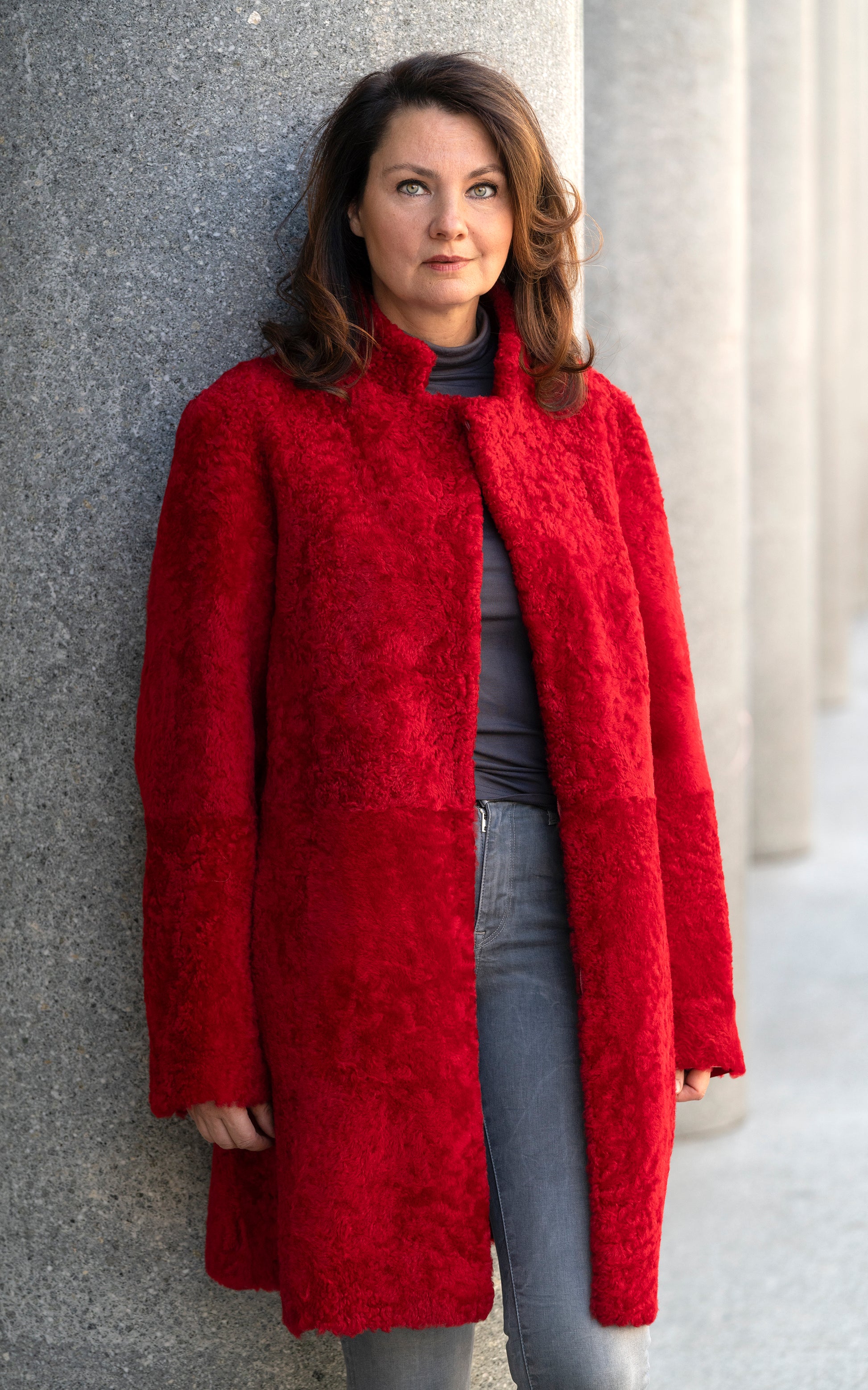 Ein wunderschöner Hingucker Mantel aus Merino Lammfell mit leichter Struktur auf der Fellseite und angedeuteter used Look auf der Lederseite.