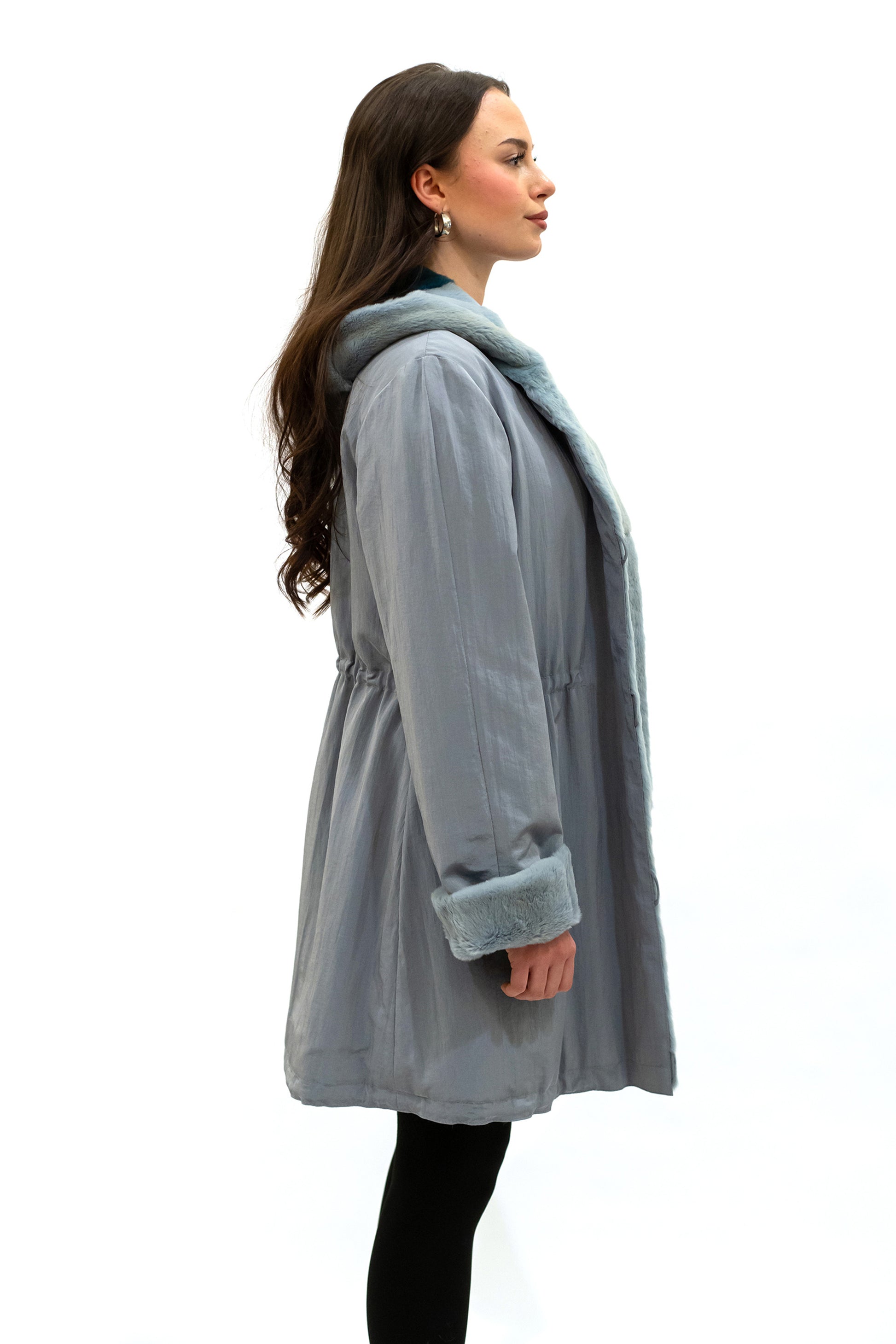 Sportlich eleganter Parka mit Kapuze aus Seidenmix im Oberstoff mit einem kuscheligen Innenfutter aus Samtwiesel in einem hellen blau.