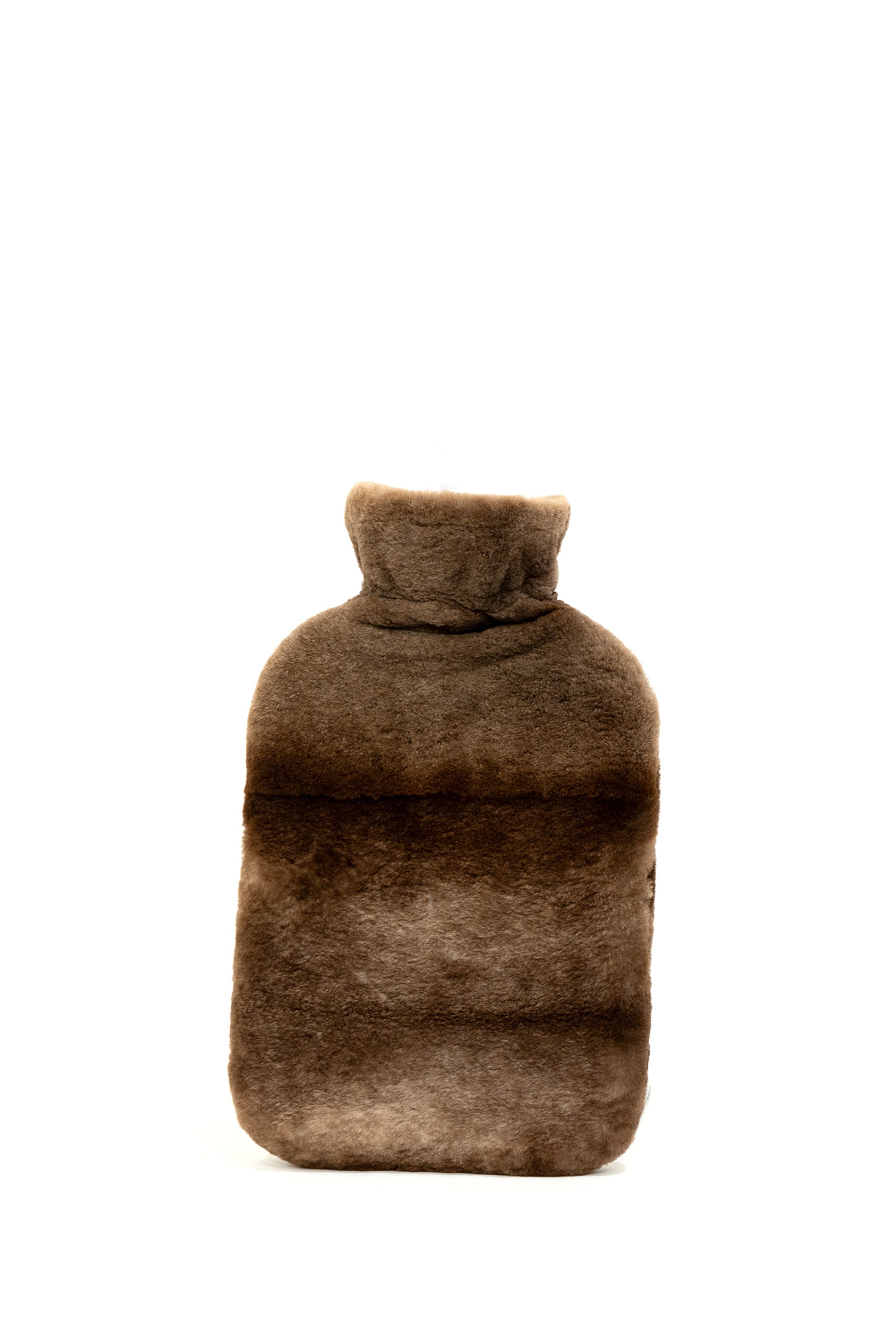 Kuscheliger Wärmflaschenbezug aus braunem Samtnerz in optischer Streifenanordnung inklusive einer grauen 2 Liter Fashy Wärmflasche aus hochwertigem Thermoplast made in Germany.