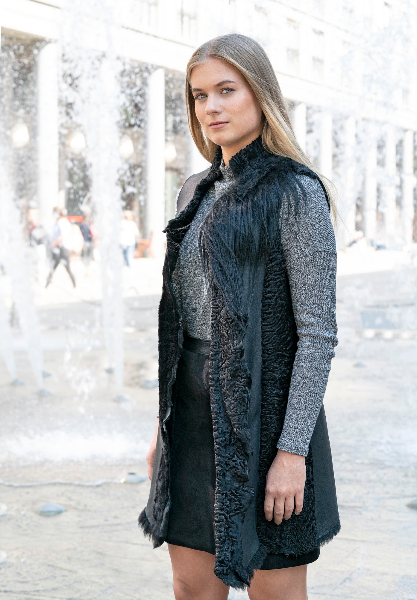 Diese Weste ist ein schöner Hingucker! Ein gelungener Mix aus Lamm-, Persianer mit Ziegenhaar Applikation.
